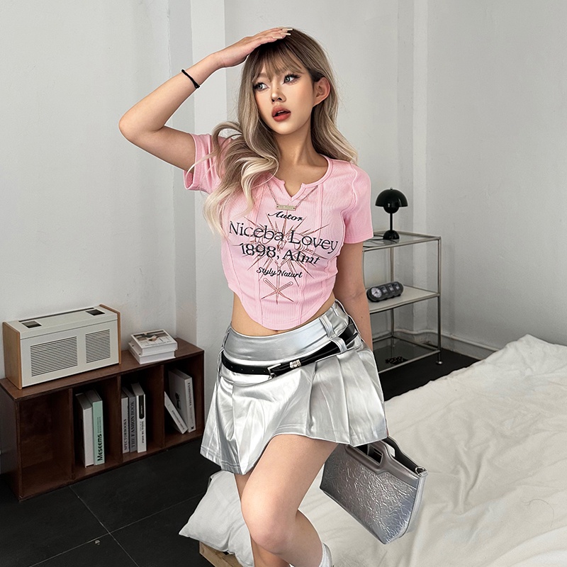 ◐♂cropped top Vitalitas manis dan pedas girlish cetak huruf retro tidak beraturan terlihat tipis dan kecil V-neck all-match T-shirt untuk wanita #COD