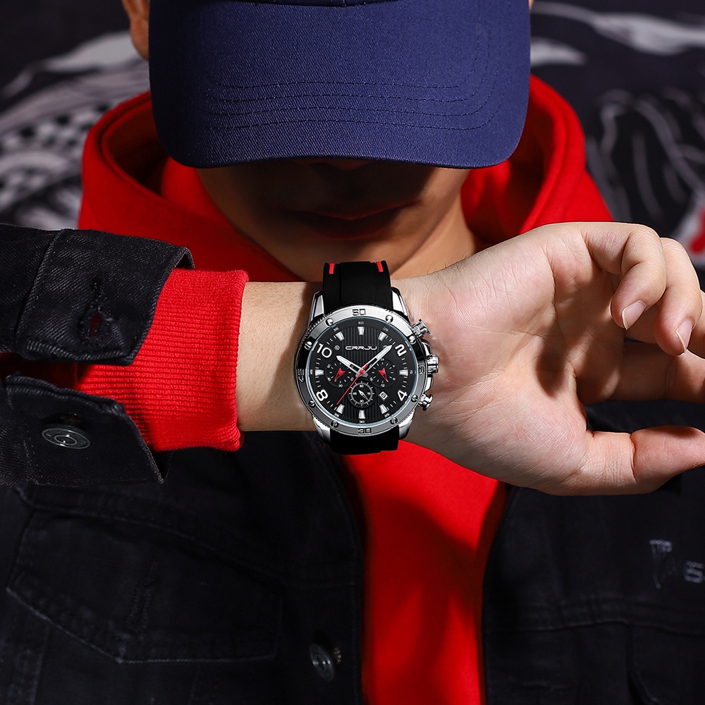 Detail CRRJU Fashion Olahraga Chronograph Quartz Jam Tangan Bisnis Pria Tahan Air Tali Silikon Jam Tangan Cowok