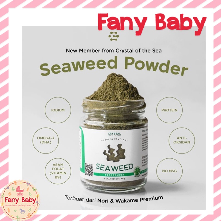Seaweed Powder (Bubuk Rumput Laut) dari Crystal of the Sea terbuat dari perpaduan Nori & Wakame kualitas premium tanpa tambahan garam, gula, MSG atau bahan-bahan lainnya. Kaya akan kandungan Iodium, Omega-3, Asam Folat / Vitamin B9, Protein dan Antioksidan.