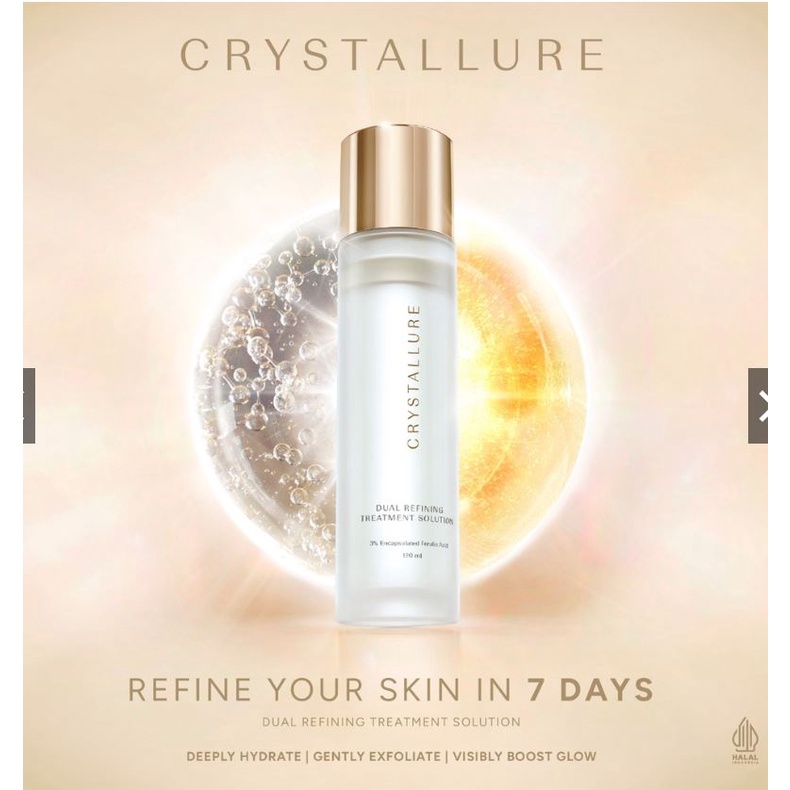 Crystallure Dual Refining Treatment Solution merupakan toner dual-phase unik yang mengeksfoliasi kulit dengan lembut dan memberikan hidrasi yang intens, telah teruji secara dermatologis memberikan kulit yang tampak lebih halus, cerah, dan tanda-tanda penuaan tersamarkan mulai dalam 7 hari*.