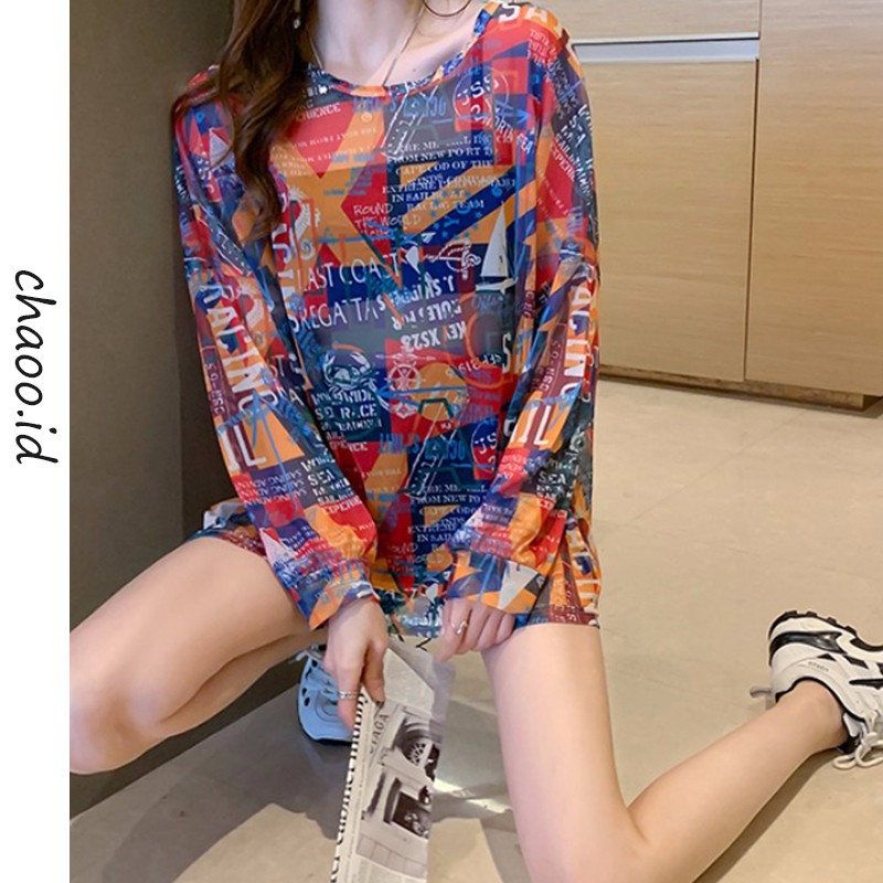 Detail [CUCI GUDANG]Musim Panas Korea Graffiti Cetak Lengan Panjang Leher Bulat Es Sutra Tabir Surya Pakaian Wanita