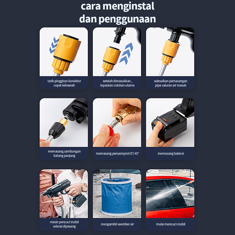 Termasuk aksesoris 1*Sambungan cepat air 1*pengisi daya 1*batang ekstensi 1*panci busa 1*Penyambung 1*pipa air 5 meter 1*Nozel tekanan tinggi 1*nozel kipas 1*jaring filter 1*panduan