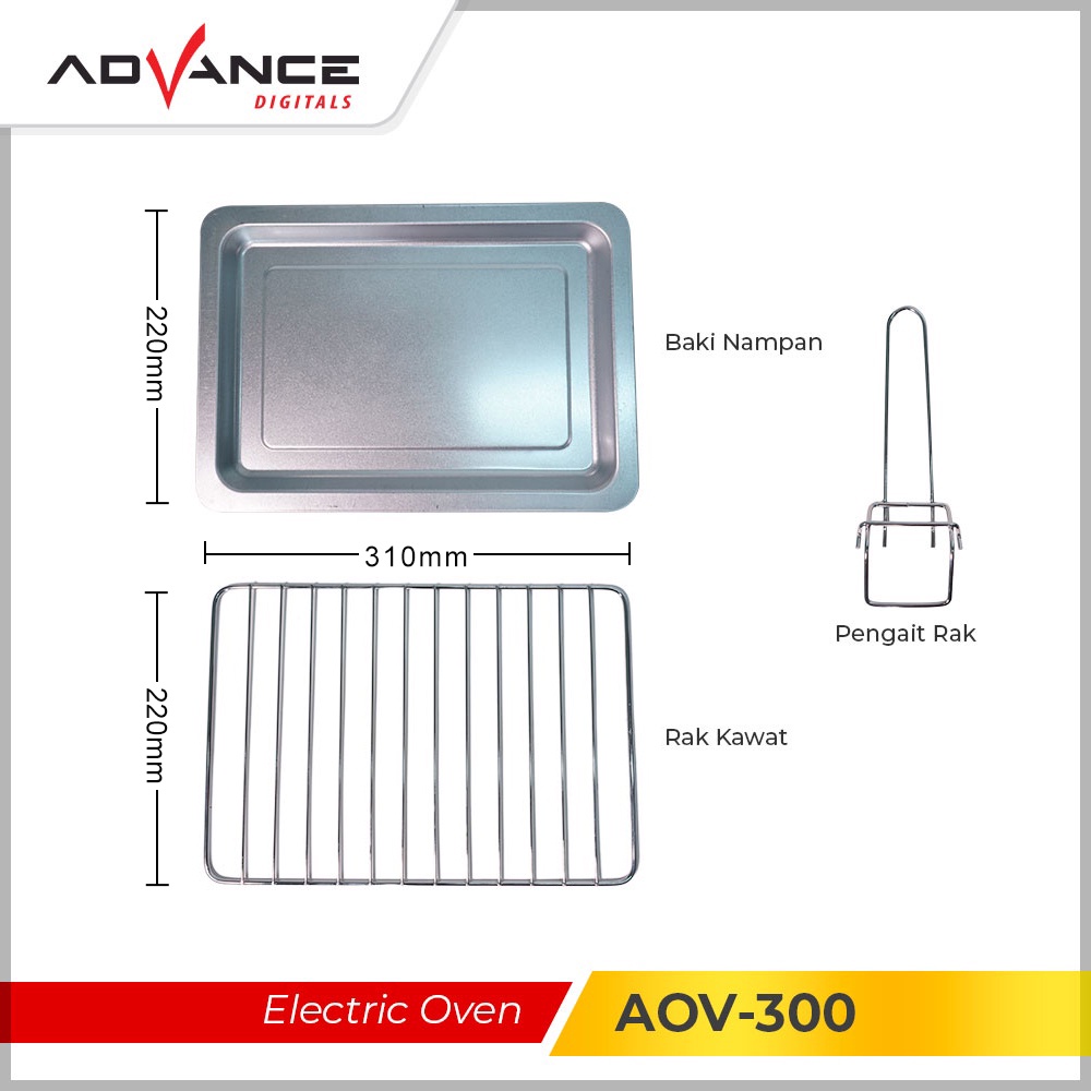 - AOV-300 Kapasitas : 20 L - Konsumsi Daya : 750 Watt - Tegangan : AC220V-240V - Frekuensi : 50 Hz - Timer : 60 Menit - Suhu Memasak : 100-230 Derajat - Baki Nampan - Rak Kawat - Interior dilapisi galvanis - Dimensi : 42.5 x 35.5 x 27.5 cm