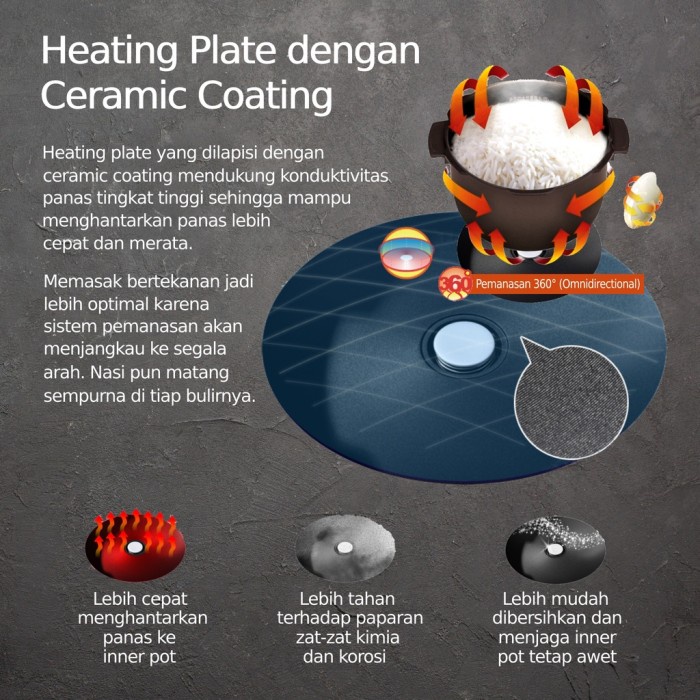 1. Smart Algorithm dengan 5 pilihan menu memasak (Glutinous Rice / Turbo / Mixed Rice / Multi Cook / Porridge). 2. Inner pot dengan lapisan Black X-Wall Coating (bebas PFOA). 3. Teknologi Katup Uap Otomatis (Soft Steam Cap). 4. Teknologi Tekanan Tinggi (High Pressure 1.8 atm). 5. Teknologi Insulasi untuk membuat nasi hangat lebih lama. 6. Teknologi Karet Gasket Premium. 7. Heating plate dengan ceramic coating. 8. Navigasi tombol bantalan dengan indikator lampu LED. 9. Pengaturan waktu dan suhu. 10. 13 sistem keamanan.
