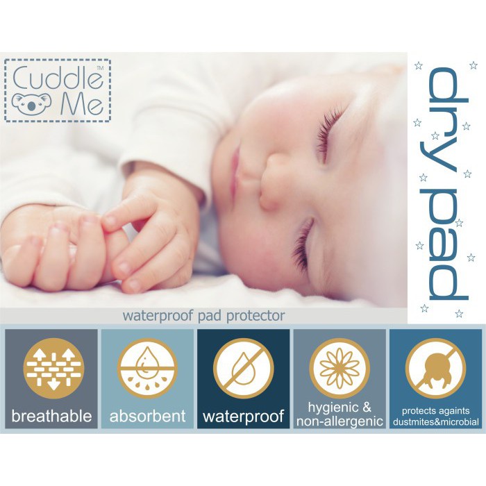 Cuddle Me Dry Pad Mattrass Protector Matras Perlak Ompol Bayi Ukuran: 90 x 70 cm Breathable Absorbent Waterproof Hygienic & Non Allergenic Saran usia : newborn keatas Perawatan: dapat dicuci dengan mesin cuci