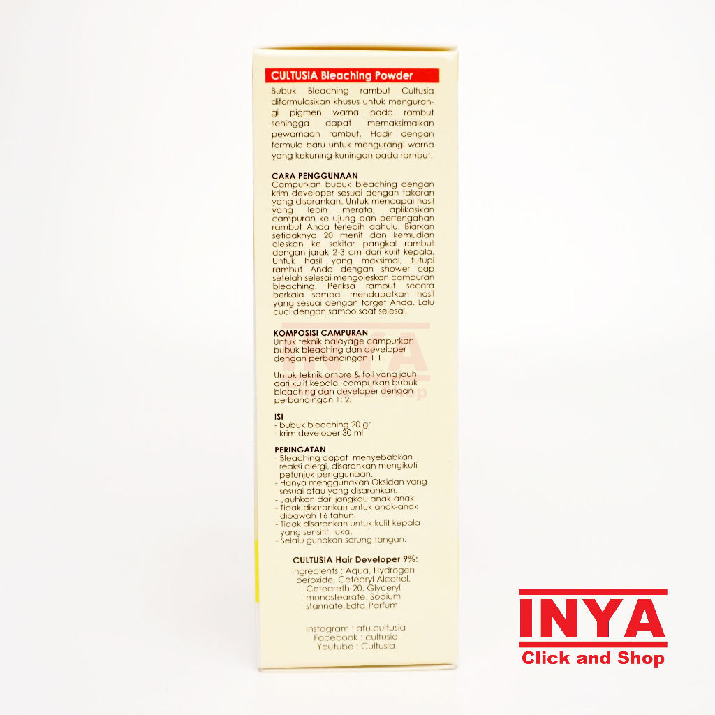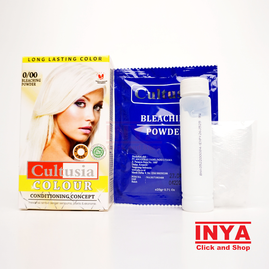 Bubuk Bleaching rambut Cultusia diformulasikan khusus untuk mengurangi pigmen warna pada rambut sehingga dapat memaksimalkan pewarnaan rambut. Hadir dengan formula baru untuk mengurangi warna yang kekuning-kuningan pada rambut.