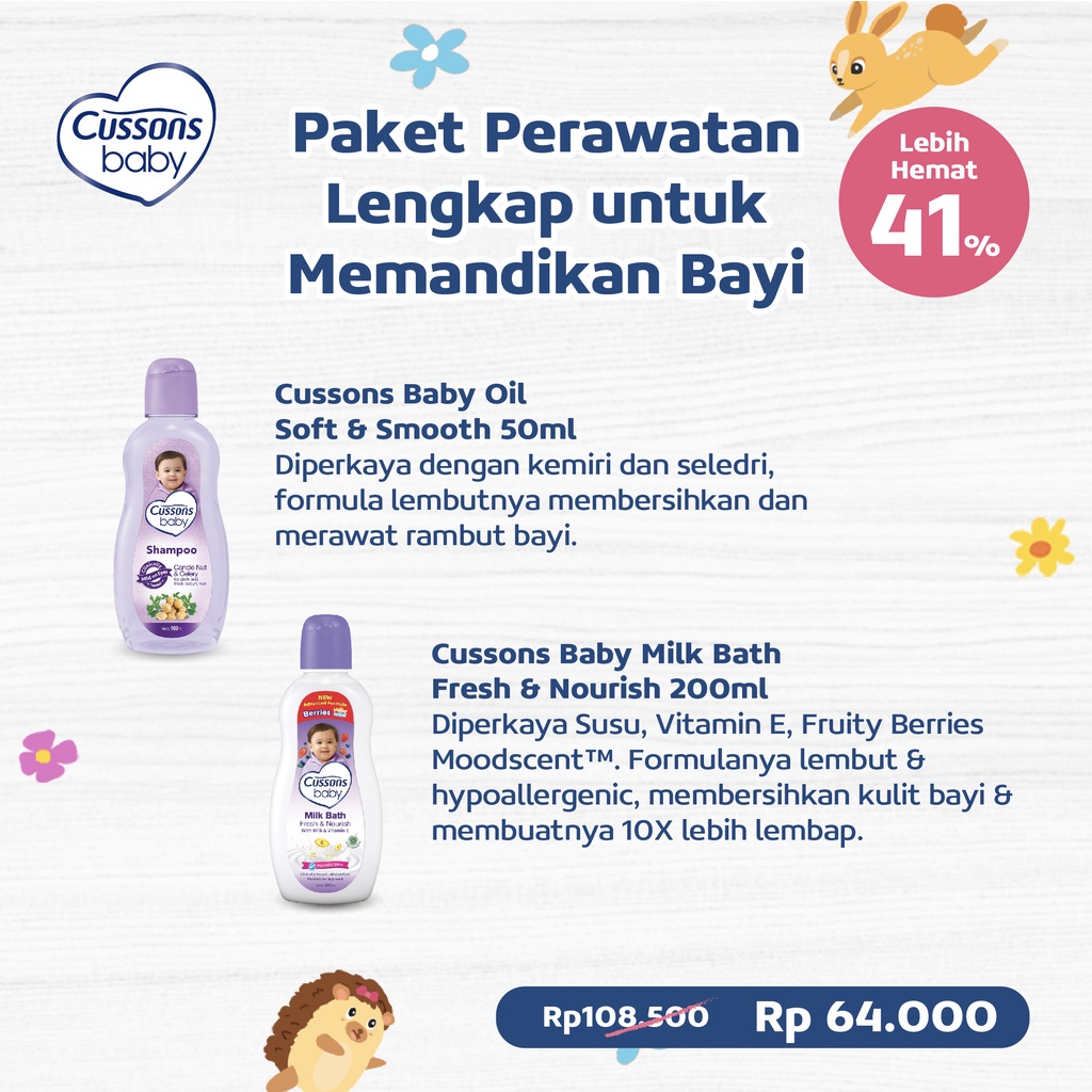 -Satu paket berisi sejumlah produk esensial perawatan bayi untuk kulit halus & lembut -Cussons Baby Powder Soft & Smooth: wangi Sakura Moodscentβ’ membuat bayi harum sepanjang hari -Baby Cream Fresh & Nourish: menjaga kelembapan kulit bayi, khususnya pada area lipatan tubuh -Cussons Baby Milk Bath Fresh & Nourish: membersihkan kulit & membuat kulit bayi 10x lebih lembap -Cussons Baby Oil Soft & Smooth: menjaga kelembapan kulit & ideal untuk memijat bayi -Cussons Baby Hair Lotion Candle Nut & Celery: nutrisi menghitamkan, mengharumkan, melebatkan rambut bayi -Teruji hypoallergenic, tidak menyebabkan iritasi dan teruji secara dermatologi -Formulanya lembut, aman untuk bayi Kulit bayi sangat lembut dan sensitif sehingga memerlukan perawatan dengan kelembutan ekstra. Kelenjar rambut bayi juga belum berfungsi dengan baik, sehingga perlu dirawat serta dirangsang pertumbuhannya. Rangkaian produk Cussons Baby Fun Bathing Pack diformulasikan dengan bahan yang lembut dan aman untuk kulit dan rambut bayi. Gunakan Cussons Baby Fun Bathing Pack sebagai perawatan lengkap untuk kulit dan rambut bayi pada saat dan setelah mandi. Temukan paket Cussons Baby lainnya: -Cussons Baby Complete Essential Pack Pink -Cussons Baby Basic Essential Pack Blue -Cussons Baby Daily Essential Pack Pink