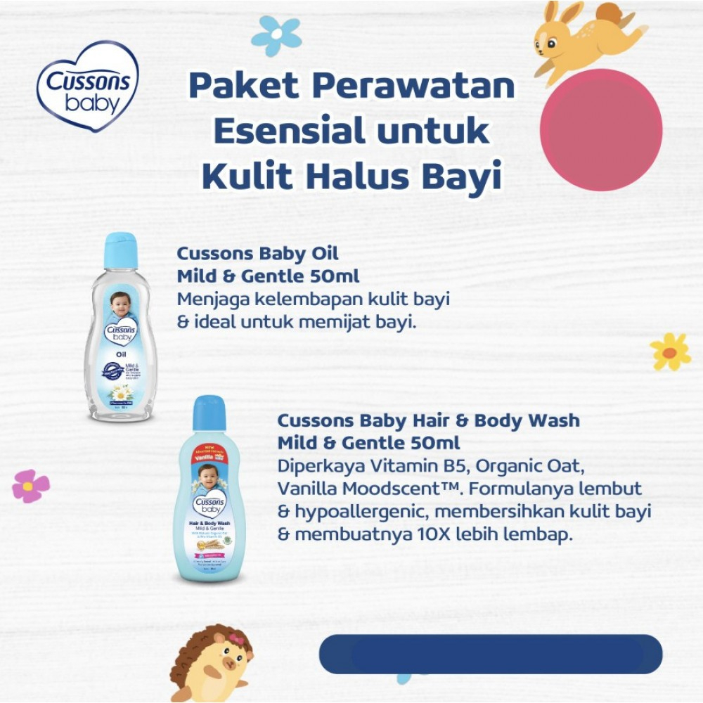 Satu paket berisi sejumlah produk esensial perawatan bayi untuk kulit halus & lembut : - Cussons Baby Powder: wangi Moodscent™ membuat bayi harum sepanjang hari - Cussons Baby Hair & Body Wash Mild & Gentle: membersihkan kulit & membuat kulit bayi 10x lebih lembap - Cussons Baby Hair Lotion Candle Nut & Celery: nutrisi menghitamkan, mengharumkan, melebatkan rambut bayi - Cussons Baby Oil: menjaga kelembapan kulit & ideal untuk memijat bayi
