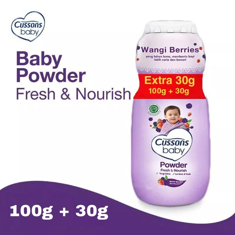 CUSSONS BABY POWDER: isi 100+30g Cuaca panas membuat bayi Anda berkeringat secara berebihan sehingga kulit bayi mudah kehilangan kelembabannya dan menjadi lebih kering. Soft & Smooth,Mild & Gentle,Fresh & Nourish Baby Powder kami telah diformulasikan secara khusus untuk menjaga kulit bayi tetap halus dengan wangi bunga yang lembut Diperkaya dengan bahan alami Almond Milk yang menutrisi dan melembabkan kulit dan Rose Oil dengan keharuman yang memberi rasa nyaman. Expired =MEI 2026