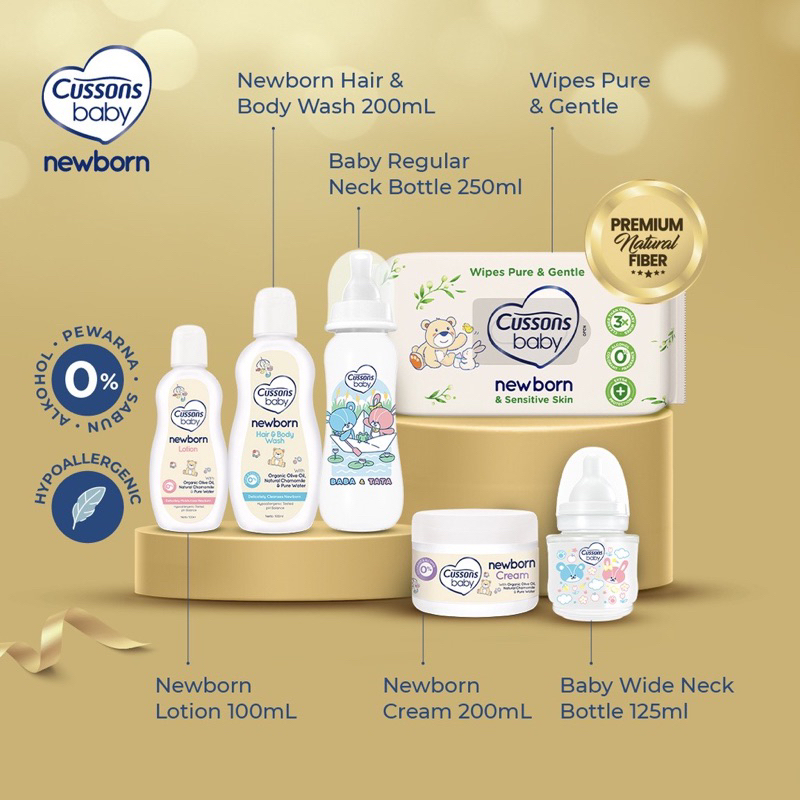 Cussons Premium Baby Gift Set terdiri dari: -1x Cussons Baby Newborn Lotion 100ml: Mengandung Minyak Zaitun Organik, Minyak Chamomile Alami & Air Murni untuk melembapkan tubuh bayi baru lahir -1x Cussons Baby Newborn Cream 50g: Mengandung Minyak Zaitun Organik, Minyak Chamomile Alami & Air Murni untuk menjaga kulit sensitif bayi -1x Cussons Baby Newborn Hair & Body Wash 200ml: Mengandung Organic Olive Oil, Natural Chamomile & Pure Water untuk melembutkan, menjaga kondisi alami kulit & rambut bayi baru lahir -1x Cussons Baby Wipes Pure & Gentle: 100% serat alami & ramah lingkungan, cocok untuk kulit bayi baru lahir & sensitif -1x Cussons Baby Wide Neck Bottle 125ml: Diameter dot lebih besar menyerupai bentuk puting ibu, mengurangi risiko bingung puting -1x Cussons Baby Regular Neck Bottle 250ml: Diameter standar, dot anti-kolik cegah kembung