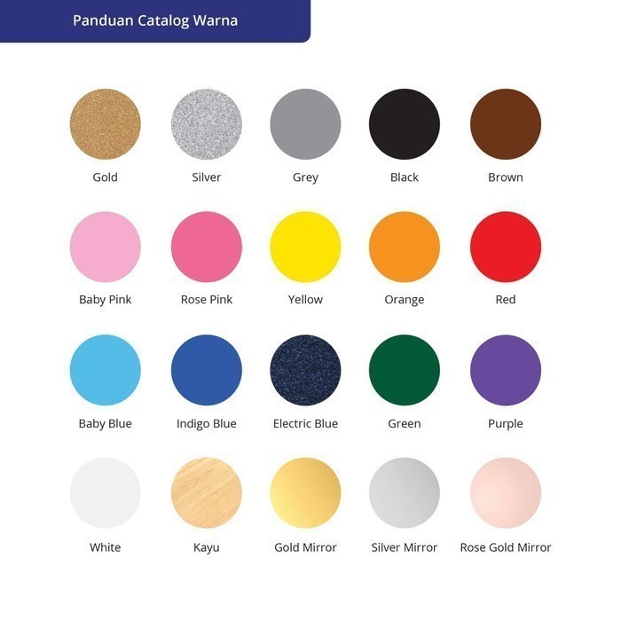 Warna Reguler : Gold, Silver, Abu - Abu, Hitam, Cokelat, Baby Pink, Rose Pink, Kuning, Oranye, Merah, Baby Blue, Indigo Blue, Electric Blue, Hijau, Ungu, Putih, Kayu