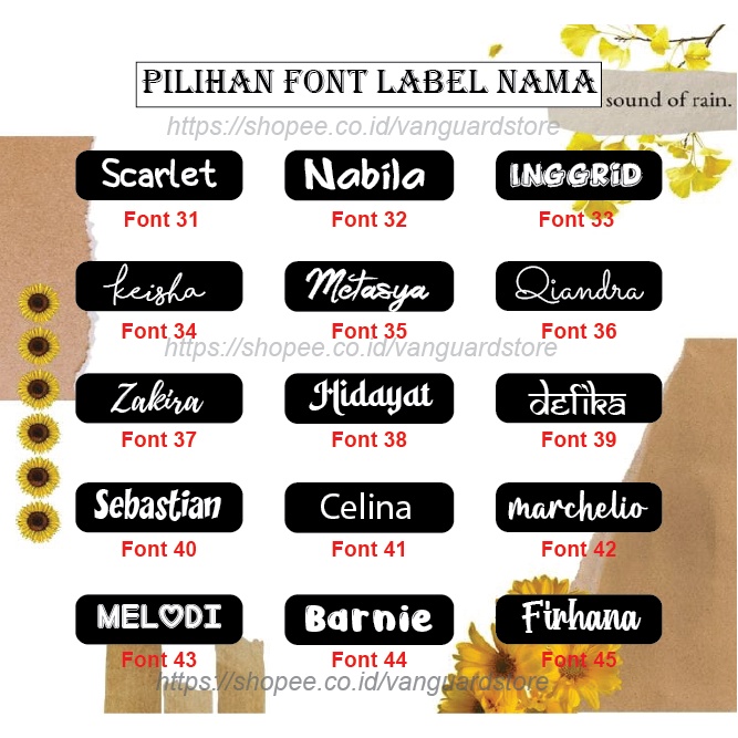 - Tentukan NAMA yang akan dicetak, KODE FONT, WARNA BACKGROUND, SIZE ( S / M / L ) - Saat Order Pilih Varian Ukuran Label - Mohon cantumkan FORMAT ORDER / DATA ORDERAN di Note saat Checkout - Tanya2 / Konfirmasi Custom Warna dan Font di Chat