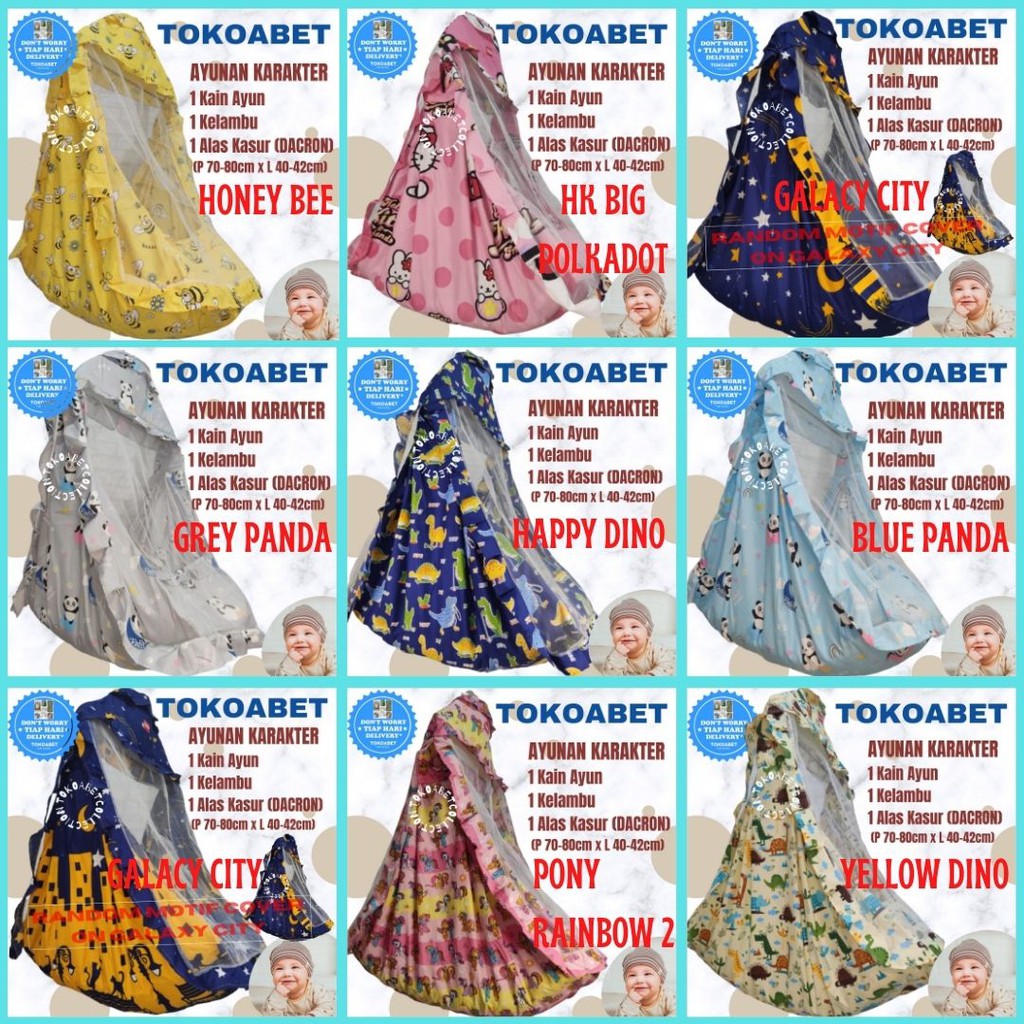 Spesifikasi (OPTIONAL) - BOLEH PILIH SESUAI KEBUTUHAN 1 TIANG+RODA(SAJA) MY DEAR ATAU POLAR 1 HANGER SEGITIGA 1 SAFETY BELT 1 AYUNAN KARAKTER* 1 KAIN AYUN 1 KELAMBU AYUN 1 ALAS KASUR ISI DACRON P= 70-80 CM L= 40-42 CM