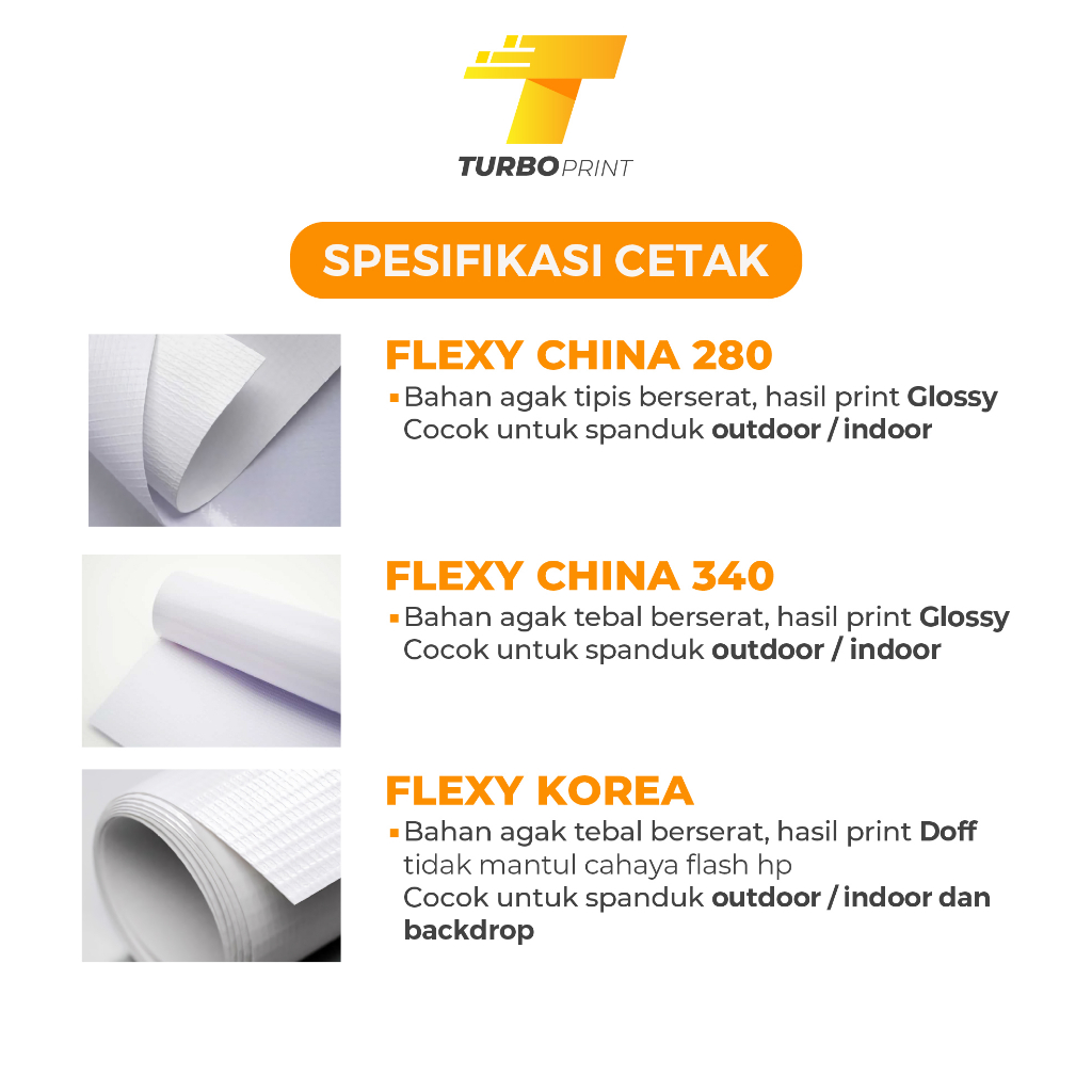 Deskripsi : 1. Bahan Flexy China 280gsm, Flexy China 340, Flexy Korea 440gsm 2. Hasil Cetak High Resolution 3. Bahan Flexy Yang Berkualitas 4. Ukuran dan harga yang tercantum untuk ukuran Per Meter Persegi 5. Free Finishing / Mata Ayam