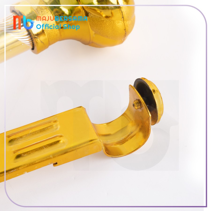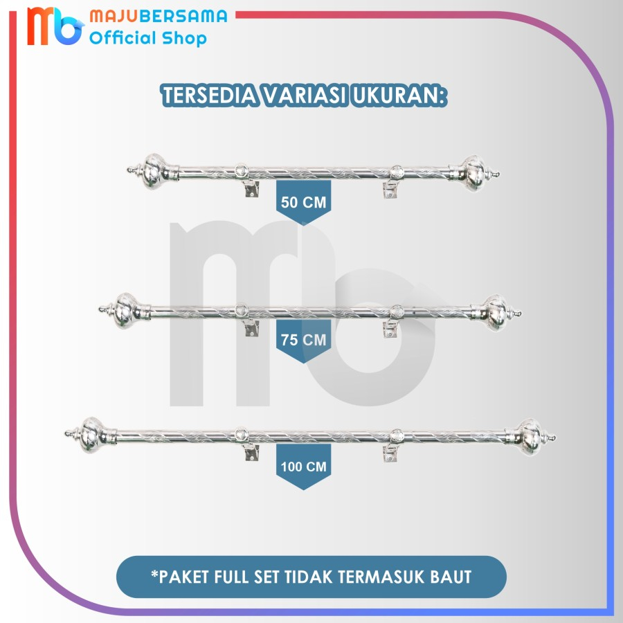 Bahan : alumunium. Satu set batang gorden pintu terdiri dari : 1.batang gorden ukuran panjang 30 - 200 CM SESUAI VARIASI ,diameter 2.3 cm 2.penyangga gorden 2 pcs 3.tutup / endcup 2 pcs 4. BONUS paku ukuran 2cm 2 pcs ( PAKU HANYA BONUS , klu tidak ada no complain ,kita usahakan ada ) Klu penyangga yg seperti gambar habis akan diganti penyangga model lain Ready warna emas dan silver. Silahkan diorder Bunda..