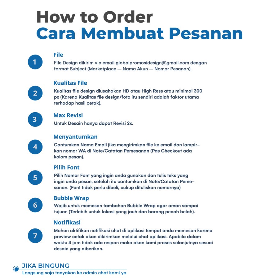MOHON DIPERHATIKAN CARA ORDER CUSTOM : 1. TULIS DI BAGIAN KETERANGAN, TULIS YANG INGIN ANDA CETAK MISAL "SPORT" 2. PILIH FONT YANG INGIN DIGUNAKAN DENGAN MENULISKAN NOMOR URUT FONT. (nomor urut font dapat dilihat di image font yang tersedia) 3. JELASKAN POSISI LOGO YANG ANDA INGINKAN 4. BILA DESIGN SUDAH ADA : dapat mengirim file ke kami dengan ketentuan berikut: * kirim High Resolution 300 dpi dalam bentuk JPEG / PNG / PDF / PS / AI ke globalpromosidesign * area print dapat dilihat di slideshow foto produk * apabila ingin memakai warna background media yg ingin dicetak mohon berikan kami file tanpa background