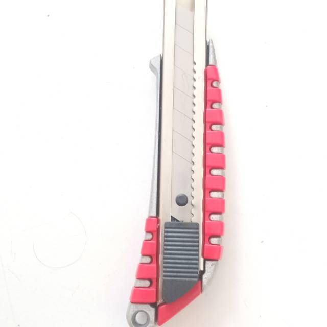 - terbuat dari metal - body dibalur karet agar tidak slip - kunci otomatis - panjang 17 cm - tajam untuk memotong kardus tebal - warna metal silver - warna karet bantalan merah