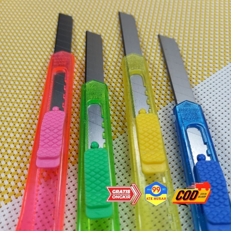 cutter kecil warna warna menarik,stainless tajam. untuk keperluan sekolah,kantor,rumah tangga dan kebutuhan sehari hari