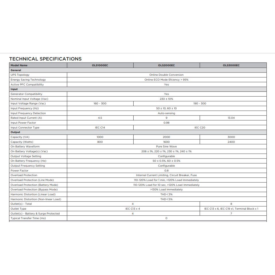 CyberPower OLS2000EC menyediakan cadangan baterai dan perlindungan daya yang andal untuk perangkat multimedia, peralatan IT, komputer, workstation, perangkat NAS/Penyimpanan, perangkat telekomunikasi, perangkat jaringan, sistem keamanan/darurat, dan sistem pengawasan. UPS mengadopsi topologi konversi ganda untuk memberikan kualitas daya yang optimal serta Mode ECO untuk menghemat daya dan menghemat biaya energi. Selain itu, produk ini kompatibel dengan generator untuk mencapai kontinuitas daya dan dirancang dengan Smart Battery Management (SBM) untuk memperpanjang masa pakai baterai. Untuk mengurangi kebisingan dan memastikan kenyamanan yang lebih baik bagi pengguna, UPS dilengkapi dengan kipas berkecepatan variabel untuk memberikan manajemen termal otomatis berdasarkan beban daya. Panel LCD berwarna menampilkan informasi sistem yang intuitif dan jelas, memungkinkan pengguna memantau dan mengonfigurasi pengaturan dengan mudah. Produk ini dapat digunakan dengan Perangkat Lunak Manajemen PowerPanel untuk mencapai pemantauan real-time dan manajemen jarak jauh UPS.