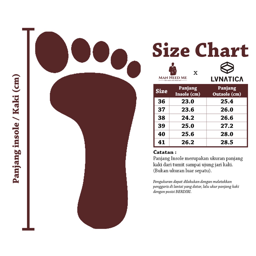 Size Chart (Insole/Panjang kaki) : Size 36 : 23.0 cm Size 37 : 23.6 cm Size 38 : 24.2 cm Size 39 : 25.0 cm Size 40 : 25.6 cm Size 41 : 26.2 cm (Untuk cara Pengukuran, silakan lihat di panduan ukuran)
