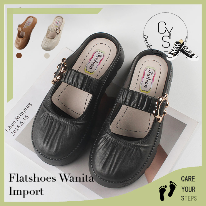 Sepatu Wanita > Sandal > Sandal Flat > CYS Sandal Sepatu Slop Wanita Cewek Motif Kerut Tali Gesper Bunga Kekinian Simpel Korea Fashion Style Rumah Import Balance SPT-63