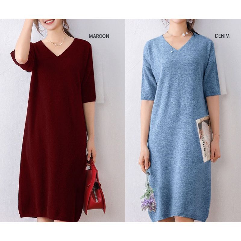 Detail (D201) Slit short sleeve v neck knit dress midi rajut wanita