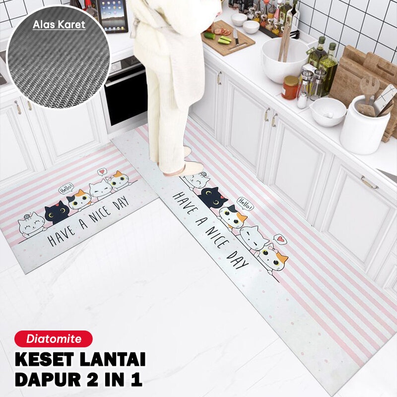 2 in 1 Kitchen Mat ini cocok untuk keset alas lantai di dapur utamanya maupun ruang tamu, ruang belajar dan tempat lainnya. Bagian bawah keset ada anti slip, keset bisa nempel di keramik rumah sehingga tidak berpindah tempat. Bahan keset dapat menyerap air dan debu.