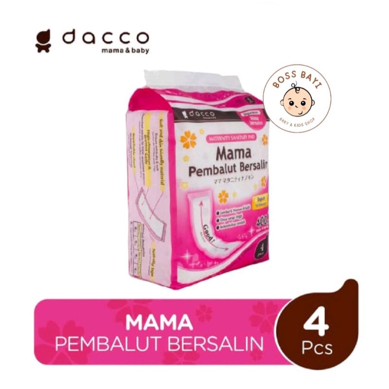 Dacco Mama Pembalut Bersalin & Nifas merupakan pembalut yang dirancang khusus untuk Ibu yang melahirkan atau saat masa nifas. Pembalut Dacco ini dirancang dengan telnologi Jepang Max Absorption yang cepat dan menjaganya tetap kering serta menjaga agar Ibu tetap bersih dan higienis.