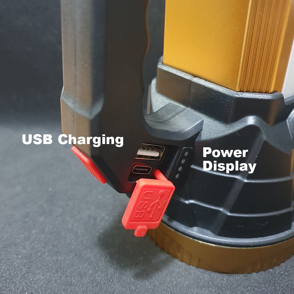 Spesifikasi : - Jarak : 300M - Warna Lampu : Putih - Bentuk Fokus : Bulat - Zoom In/Out : Tidak - Letak Switch On/Of : Dibagian atas senter - Daya : 50WATT - Mode Cahaya : Terang, Redup, Strobo, Lampu Emergency - Mode Isi Ulang Baterai : Di Cas Langsung Colok Di Senter - USB : Tersedia Type C - Ukuran : 173 x 85 x 110 mm - Berat : 350g