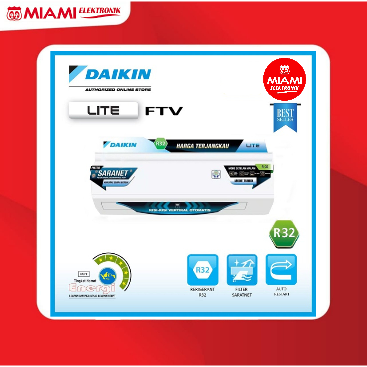 Apa Saja fitur Keren FTV15CXV14 ? 5000 Btu/h - Bisa mendinginkan ruangan sampai 10m2. Garansi 1 Tahun Sparepart, 3 Tahun Kompresor. Mulai Ulang Otomatis - AC akan mengingat pengaturan mode operasi, dan secara otomatis kembali ke pengaturan tersebut ketika listrik kembali menyala. Mode Powerful - Fungsi ini nyaman untuk meningkatkan pendinginan kinerja dalam waktu 20 menit. R32 - Refrigeran ramah lingkungan dengan nol ODP (Ozone Depletion Potential) dan lebih cepat dingin.