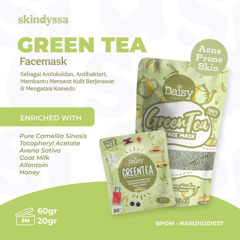 Daisy Organic Greentea Facemask dibuat dari bahan-bahan alami yang baik digunakan untuk perawatan wajah harian. Mengandung Matcha Greentea sebagai antioksidan dan antibakteri yang dapat membantu merawat kulit berjerawat dan mengatasi komedo. Gunakan secara teratur untuk hasil yang maksimal.
