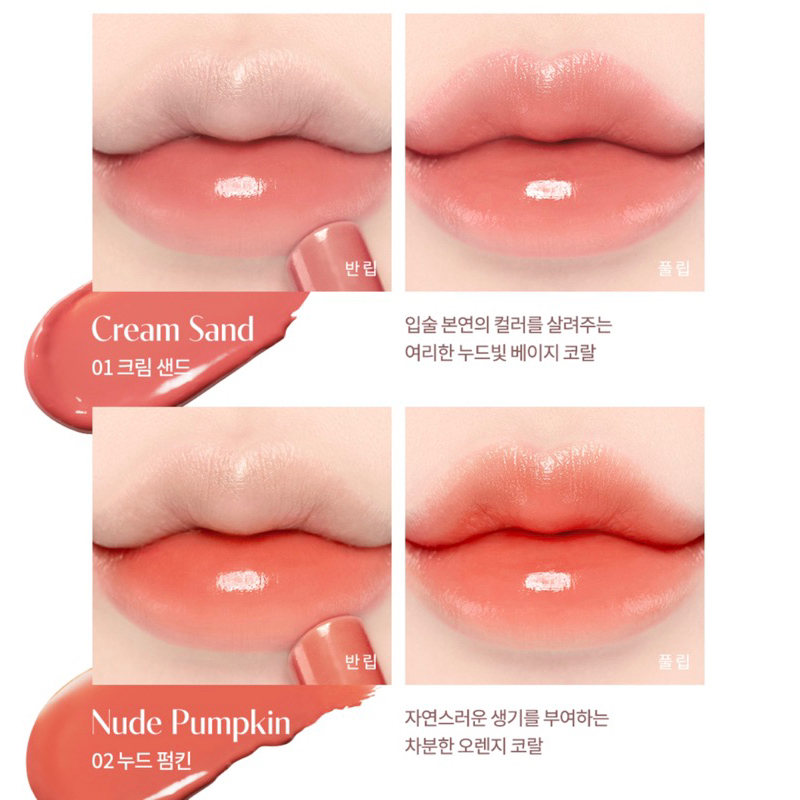 01 Cream Sand: Gentle nude beige coral enhancing the lip color 02 Nude Pumpkin: Calming orange coral to give vitality 03 Peaches: Lovely peach coral to brighten the skin 04 Rosehip: Calm pink coral for daily makeup on every skin tone 05 Baby Salmon: Salmon-coral for gentle, soothing lips 06 Mellow Coral: Fresh coral to bring vitality 07 Pink Berry: Cool-toned pink to brighten skin 08 Cherry Drop: Refreshing cool-toned red with a cherry drop