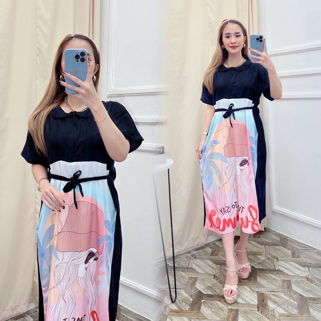 Daster Kekinian Emblem Print Kartun Cute Rayon Premium Dress Wanita Lengan Pendek Baju Fashion Kekinian