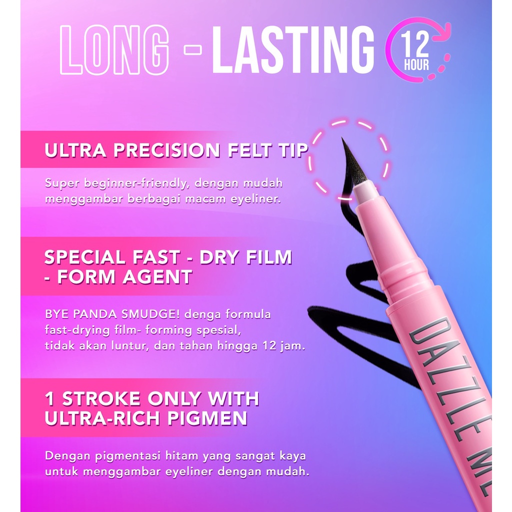 Butuh eyeliner yang cepat 'set' dengan warna yang kaya pigment dan formula tahan lama? Apalagi dengan ujung kuas dengan bahan felt yang halus, jadi sangat mudah untuk membuat eyeliner yang presisi dan BOLD! Introducing DAZZLE ME Hold On Waterproof Eyeliner, Dazzlers! Eyeliner yang menjawab semua kebutuhan kamu yang masih pemula di dunia per-eyeliner-an, karena memang semudah itu untuk digunakan <3 Formula tahan lama HINGGA 12 JAM; Diformulasikan dengan film-forming agent yang cepat kering, membuat DAZZLE ME Hold On Waterproof Eyeliner ini waterproof, smudge-proof & tahan lama hingga 12 jam! Felt Tip yang presisi; SUPER BEGINNER FRIENDLY dengan ujung kuas berbahan felt yang presisi maksimal, sehingga mudah untuk membuat garis yang bersih. Dazzlers bisa membuat berbagi jenis eyeliner, dari yang tipis & halus, hingga yang bold & intense. Pigmentasi yang ULTRA RICH Dengan pigment warna hitam legam yang ultra kaya, dapat membuat eyeliner hitam pekat dalam 1 tarikan! Mudah kaann? Tahan lama HINGGA 12 jam, Waterproof, Smudge-proof Felt tip yang PRESISI & mudah digunakan Warna yang kaya pigmentasi, menghasilan eyeliner hitam pekat Dengan bahan utama: Carbon Black, Hyaluronic Acid; bahan alami aman untuk kulit sensitif Talc, Fragrance, Paraben & Alcohol FREE Warna: 01 Black