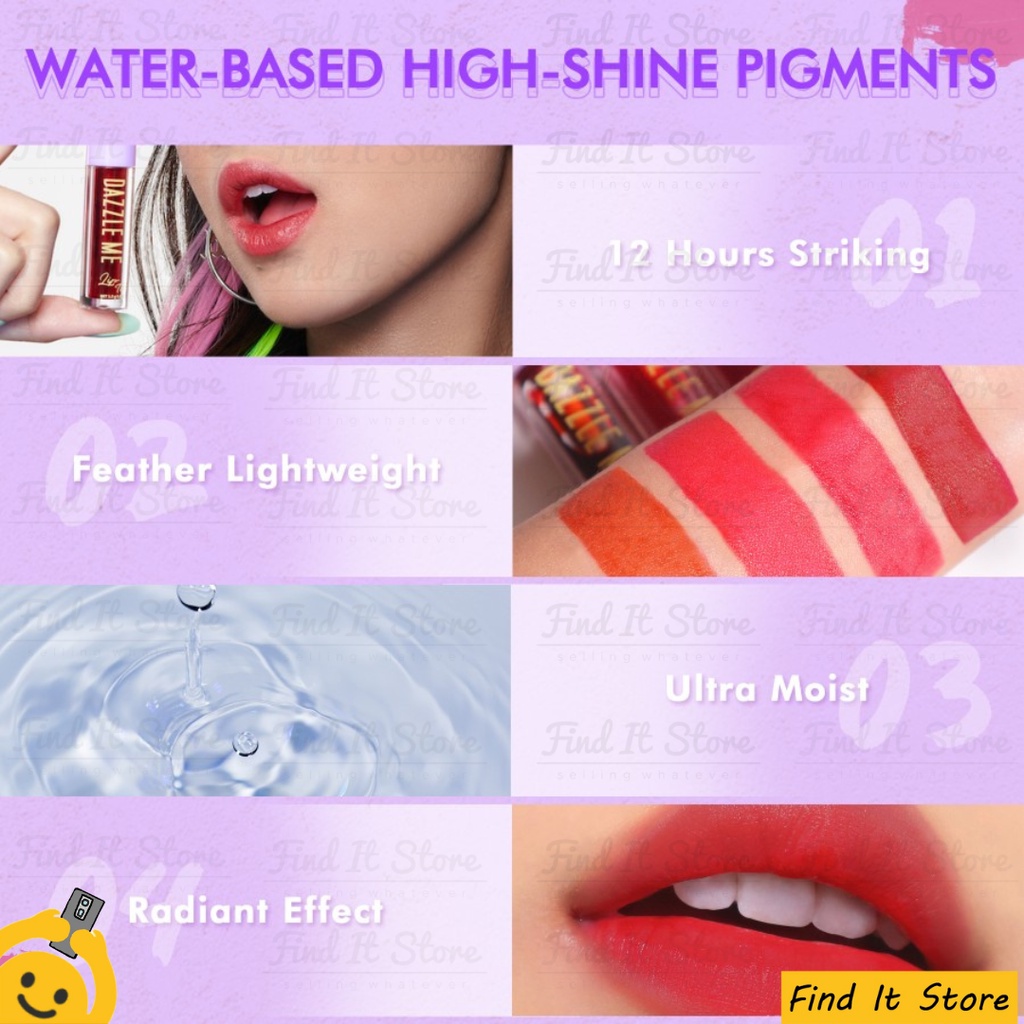 💜 Ink-Licious Lip Tint 2.5g Bibir sehat merona alami sekarang bisa kamu dapatkan dengan DAZZLE ME Ink-Licious Lip Tint - Natural plump look - SPECIAL water-based formula - SUPER light & nyaman di bibir - LONGLASTING hinga 12 JAM - Water-proof & transfer-proof - Lip lines & wrinkles FREE - Mengandung HYALURONIC ACID & CASTOR OIL untuk bibir sehatmu
