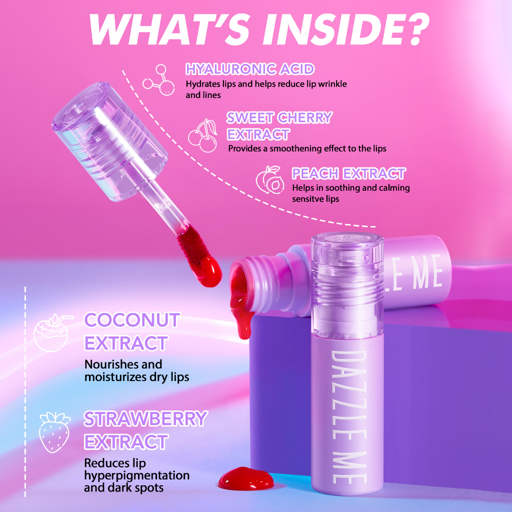Nikmati look glossy berpigmentasi tinggi, yang akan berubah menjadi stain matte yang tahan lama. Ringan, glossy tapi tidak lengket, Tidak membebani bibir. Mengandung ekstrak dari semua buah favorit Peach, Strawberry, Coconut, Menutrisi dan melembabkan bibir.
