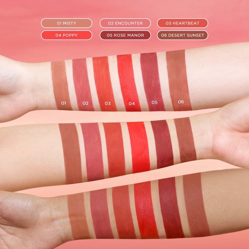 1.Aplikasikan lip cream mulai dari bagian tengah bibir. 2.Ratakan pada seluruh bibir dengan jari. PERHATIAN Hanya untuk pemakaian luar, Hentikan pemakaian segera jika terjadi iritasi. Jauhkan produk dari sinar matahari langsung atau suhu tinggi. Jauhkan jangkauan dari anak-anak. 01 Misty 02 Encounter 03 Heartbeat 04 Poppy 05 Rose Manor 06 Desert Sunset