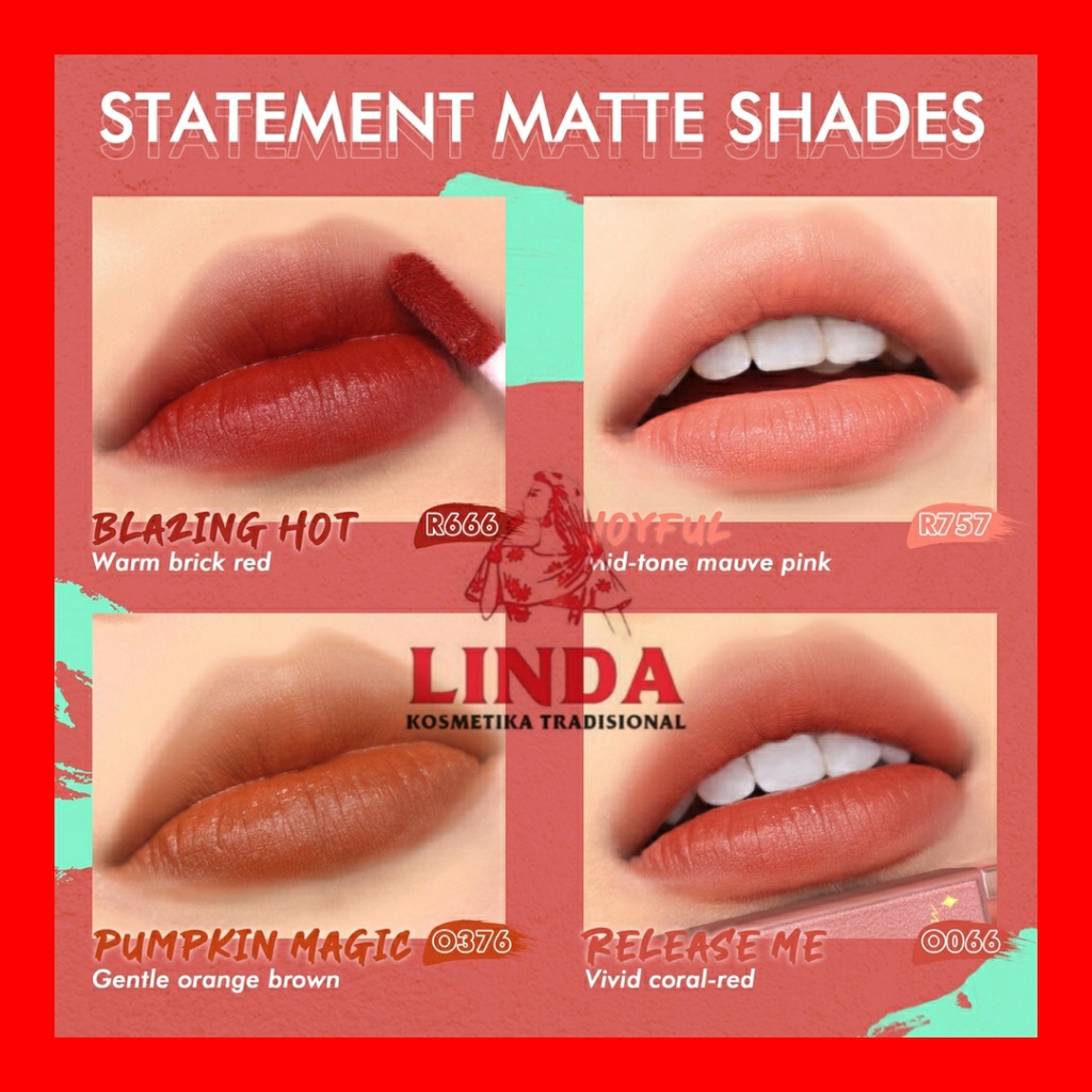 ๐ LONGLASTING hingga 12 JAM ๐ SUPER PIGMENTED colors ๐ Tekstur lembut seperti MOUSSE ๐ LIGHTWEIGHT & melembapkan bibir ๐ Paraben, Alcohol & Mineral Oil FREE ๐ Mengandung DOUBLE MOISTURIZING ingredients