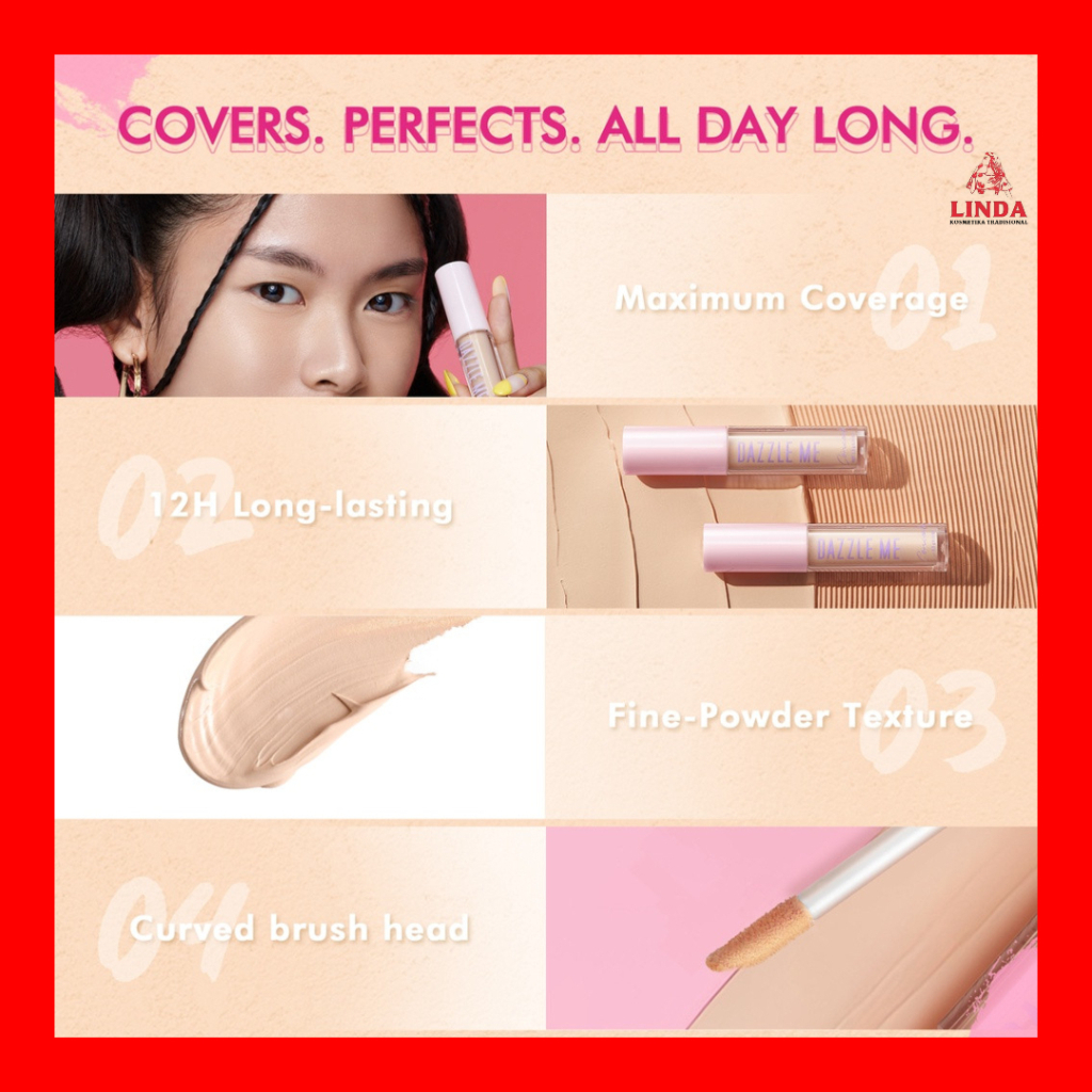 DAZZLE ME Our Secret Cover Concealer dapat menyamarkan lingkaran mata, warna kulit tidak merata dan bekas jerawat secara efektif. Dengan tekstur yang ringan & halus, membuatnya sangat mudah untuk diratakan pada kulit, menghasilkan riasan kulit yang mulus. Kandungan bahan NATURAL KHUSUS juga membuatnya menempel sempurna pada kulit sepanjang hari, tanpa perlu khawatir make up bergeser. Mengandung MOISTURIZING ingredients: