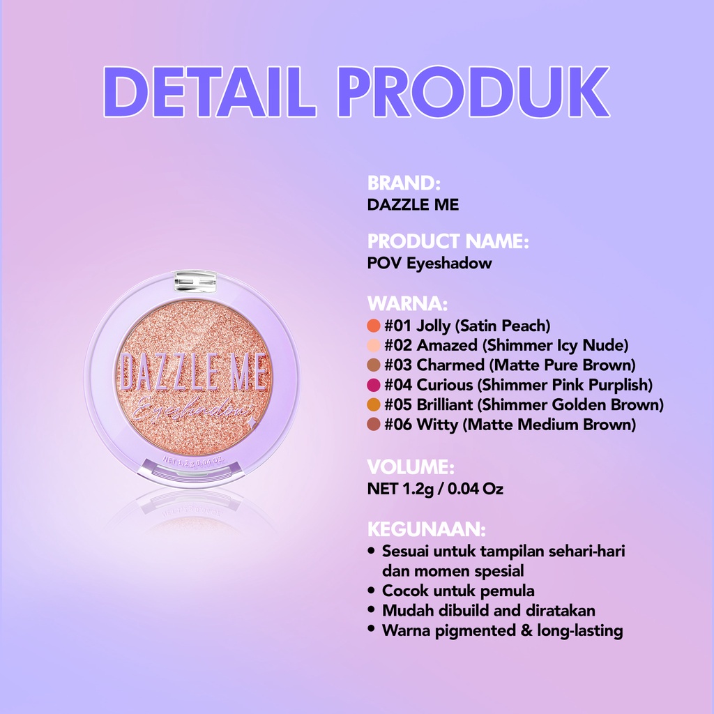 Detail DAZZLE ME POV Eyeshadow Indonesia / 1.2g / Long Staying High Pigmentation Easly Build And Blend / Ultra Dazzling Result Effortless Blendable Long Wear Power / Glitter Shimmer Matte Shadow Glowing Glow / Cosmetic Makeup Eyes Make Up Kosmetik Mata Series