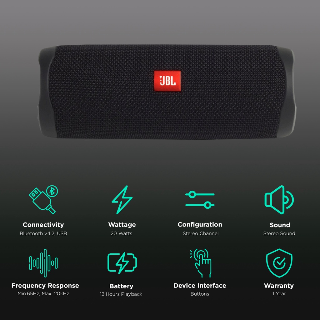 Isi paket: 1x speaker jbl flip 5 1x kabel charge 1x kabel aux 1x buku petumjuk 1x free packing