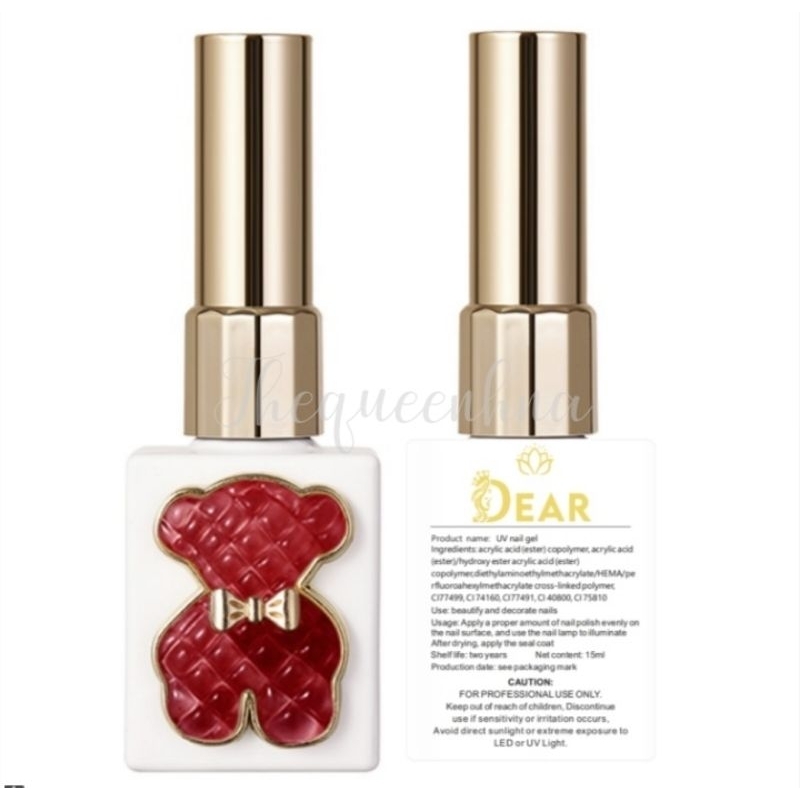 PERHATIAN: TIDAK AKAN KERING TANPA MENGGUNAKAN UV LAMP DEAR Premium Nail Polish kutek gel 100% original. Kemasan botol kaca 15ml(Big Size) Barang 100%BARU bukan BEKAS Pertama diIndonesia dan satu-satunya premium gel yang dipadukan dengan kemasan lucu,cantik dan unik. Produk kami asli brand Dear bukan barang tiruan dengan beruang/Teddy Bear yang full color sesuai warna isinya,sangat manis terutama jika terpajang dirak rumah,rak salon atau rak studio nail art anda.Buruan koleksi kutek gel kualitas premium dengan kemasan yang lucu dan imut ini.