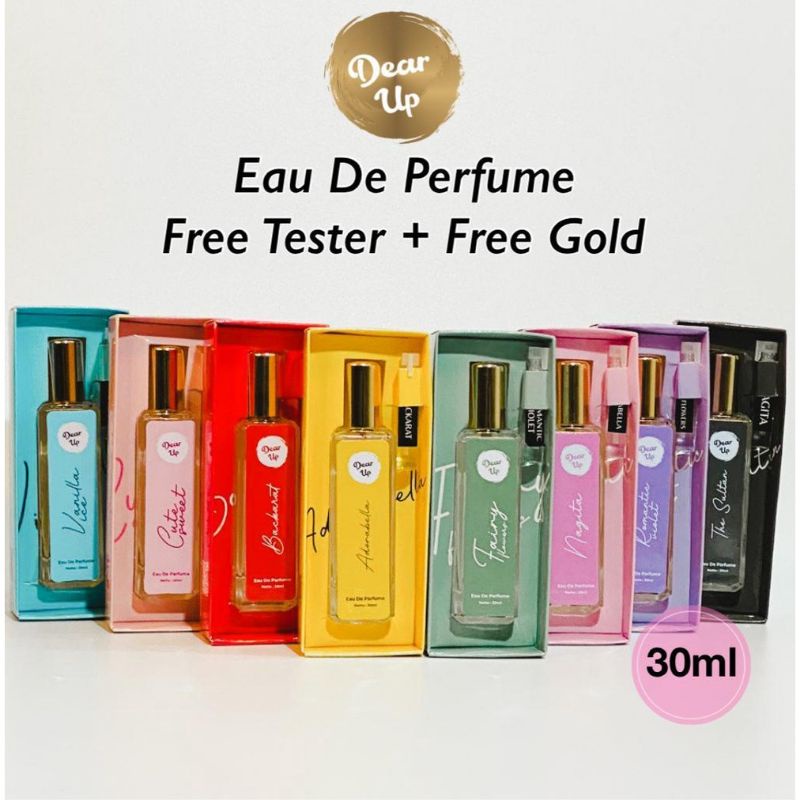 Parfum EDP Premium dari Dear Up dengan ketahanan aroma +_ 12 jam Cukup 1x semprot badan sudah wangi, tahan lama, tetapi Soft dan tidak menyengat. 1 PUSH Dear Up EDP 30 ml sudah wangi banget