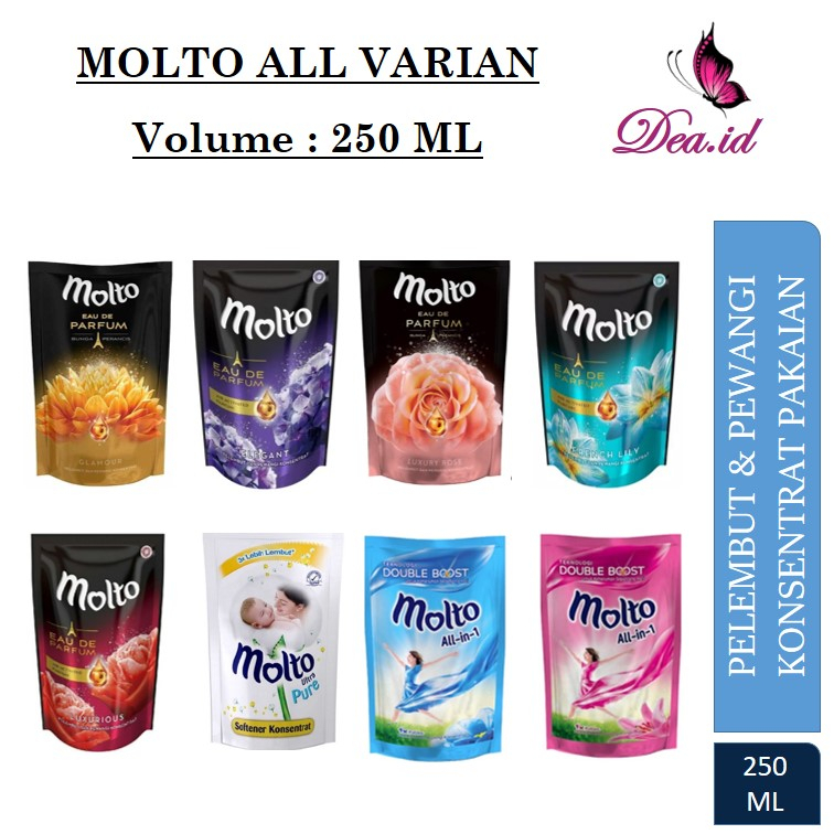 MOLTO PEWANGI FLORAL BLISS (BLUE) MOLTO PEWANGI FLOWER SHOWER (PINK) MOLTO PEWANGI FRUITY PASSION (ORANGE) MOLTO PEWANGI LUXURIOUS PLEASURE (PURPLE) MOLTO SOFTENER SPRING BLUE MOLTO SOFTENER BLOSSOM PINK MOLTO SOFTENER PURE (WHITE) MOLTO SOFTENER ALOE VERA & AVOCADO (GREEN) MOLTO ULTRA BLUE MOLTO ULTRA PINK MOLTO ULTRA GREEN MOLTO ULTRA SEKALI BILAS BLUE MOLTO ULTRA SEKALI BILAS PINK MOLTO ULTRA SEKALI BILAS GREEN MOLTO ULTRA SEKALI BILAS ANTI-BAKTERI (GREEN) MOLTO ULTRA SEKALI BILAS AROMA ESSENCE ENERGIZING (BLACK) MOLTO ULTRA SEKALI BILAS AROMA ESSENCE INSPIRING (RED) MOLTO ULTRA SEKALI BILAS AROMA ESSENCE REFRESHING (GOLD) MOLTO ULTRA SEKALI BILAS AROMA ESSENCE INDULGING (PURPLE)