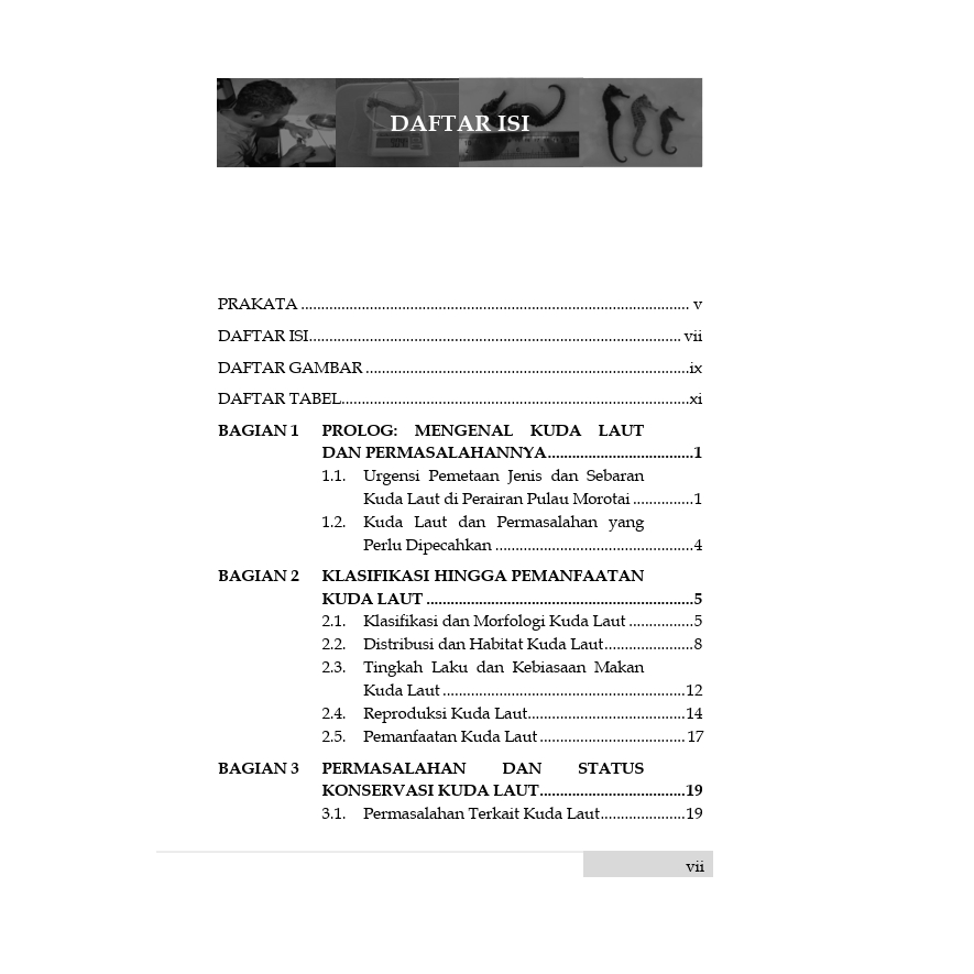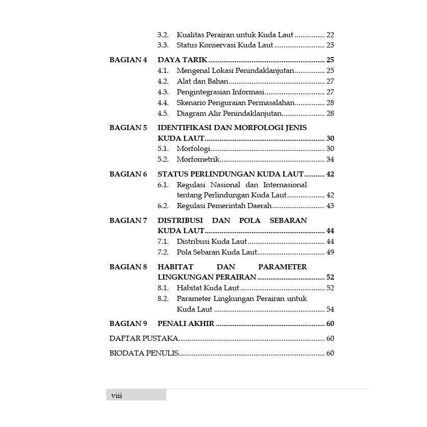 Berikut Daftar Isi Buku Perikanan dan Kelautan yang berjudul Buku Jenis Kuda Laut (Hippocampus sp.) di Kawasan Konservasi Perairan (KKP) Pulau Morotai, diantaranya: Bagian 1 Prolog: Mengenal Kuda Laut dan Permasalahannya Bagian 2 Klasifikasi Hingga Pemanfaatan Kuda laut Bagian 3 Permasalahan dan Status Konservasi Kuda Laut Bagian 4 Daya Tarik Bagian 5 Identifikasi dan Morfologi Jenis Kuda Laut Bagian 6 Status Perlindungan Kuda Laut Bagian 7 Distribusi dan Pola Sebaran Kuda Laut Bagian 8 Habitat dan Parameter Lingkungan Perairan Bagian 9 Penali Akhir
