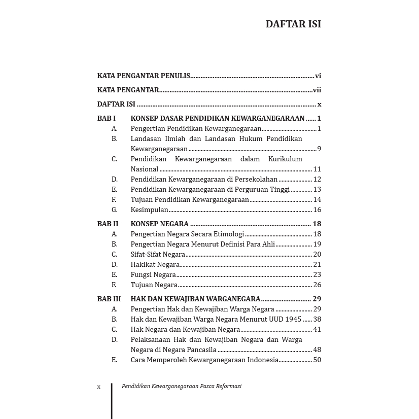 Berikut Daftar Isi Buku Pendidikan yang berjudul Pendidikan Kewarganegaraan Pasca Reformasi Penguatan Civic Education dan Kebangsaan Indonesia diantaranya: Bab I Konsep Dasar Pendidikan Kewarganegaraan Bab II Konsep Negara Bab III Hak dan Kewajiban Warga Negara Bab IV Demokrasi Pancasila Bab V Identitas Nasional Bab VI Penegakan Hukum (Rule of Law) Bab VII Wawasan Nusantara Sebagau Geopolitik Indonesia Bab VIII Wawasan Kebangsaan Sehagai Geostategi dan Ketahanan Nasional Bab IX Prinsip Dasar Konstitusi Bab X Otonomi Daerah Bab XI Hak Asasi Manusia Bab XII Good Governance