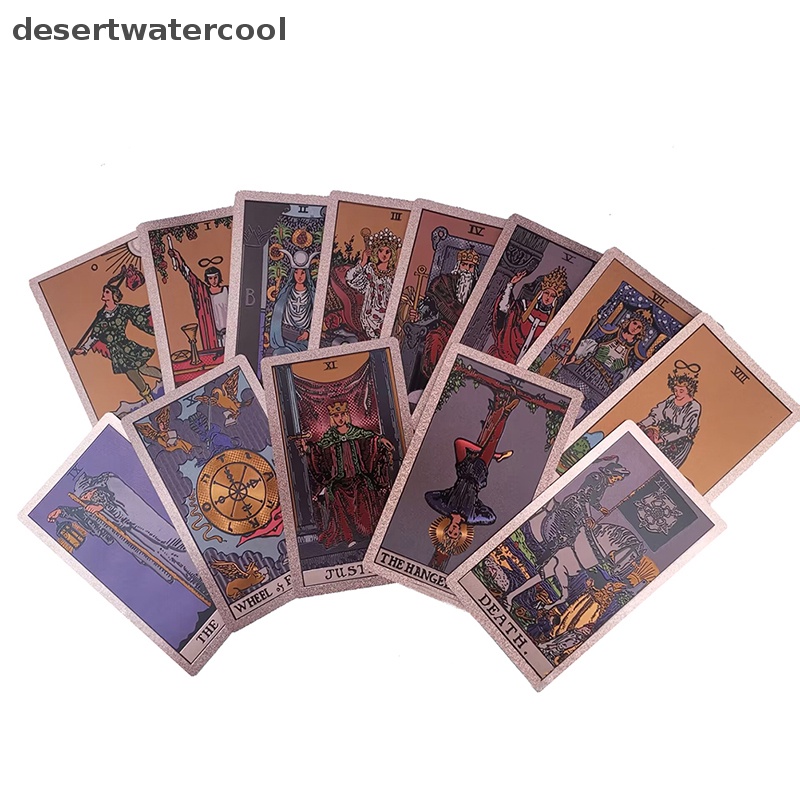 Nama: Tarot Foil Emas Kategori: permainan papan, kartu Bahan Plastik: Plastik Ukuran: 12*7 cm Fitur: tahan aus, tahan air Cara bermain: Pelayan Klasik Proses: perunggu, pegas warna Tujuan: tenung, ramalan Jumlah lembar: 80