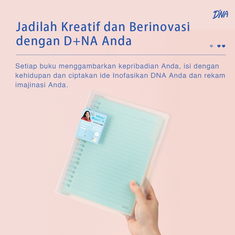 - Merk : Deli - Ukuran : A5/B5 - Material : PP - 60 Lembar - 80g paper - Tahan air, debu dan baret - Sudut binder yang tumpul sehingga tidak melukai kulit - 4 Variasi desain cover - Tidak mengandung bahan yang berbahaya