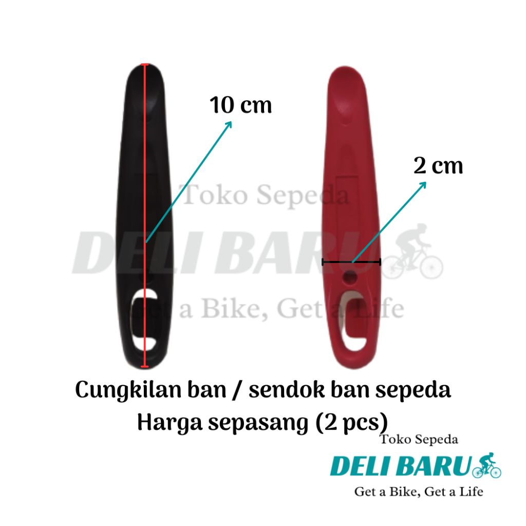 Sendok ban / alat cungkil pembuka ban sepeda. Tidak bermerk. Dimensi 10 cm x 2 cm. Harga tertera dapat 2 buah cungkilan ban (warna hitam dan warna merah).