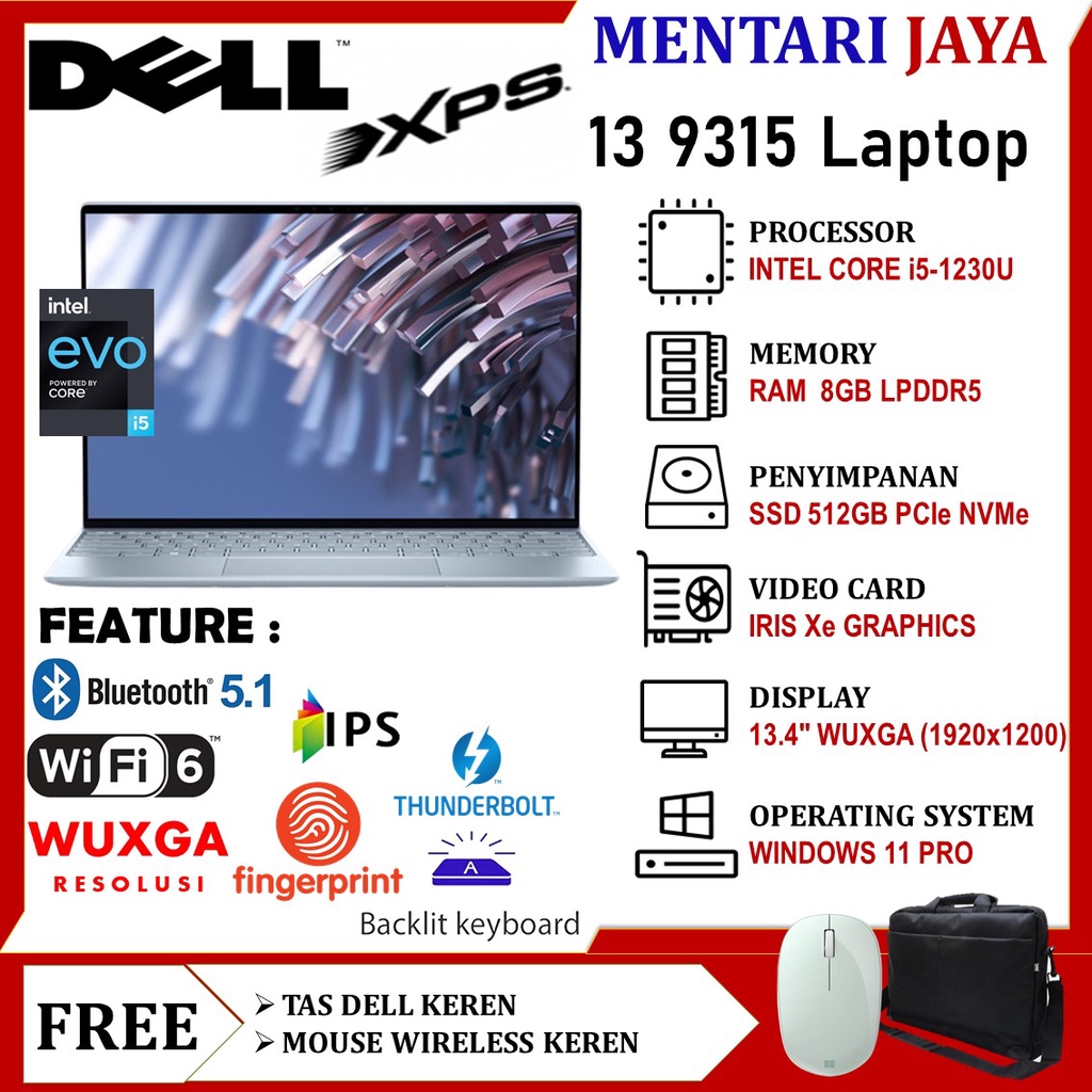 Spesifikasi : - Processor: 12th Generation Intel EVO Core i5-1230U (12MB Cache, up to 4.40 GHz, 10 cores) - Operating System: Windows 11 Pro - Graphics Card: Integrated Intel Iris Xe graphics - Memory: 8GB LPDDR5, 5200 MHz - Hard Drive: 512GB PCIe NVMe x2 Solid State Drive Onboard - Display: 13.4" WUXGA 1920 x 1200, 60Hz, Non-Touch, Anti-Glare, 500 nit, InfinityEdg - Keyboard: Sky Backlit Keyboard with Finger Print Reader - Wireless: Intel Wi-Fi 6 AX201 2x2 .11ax 160MHz + Bluetooth 5.1 - Primary Battery: 3 Cell, 51 Wh, integrated - Power: 65W Type-C EPEAT Adapter - Camera: 720p at 30 fps HD RGB camera, 400p at 30 fps IR camera